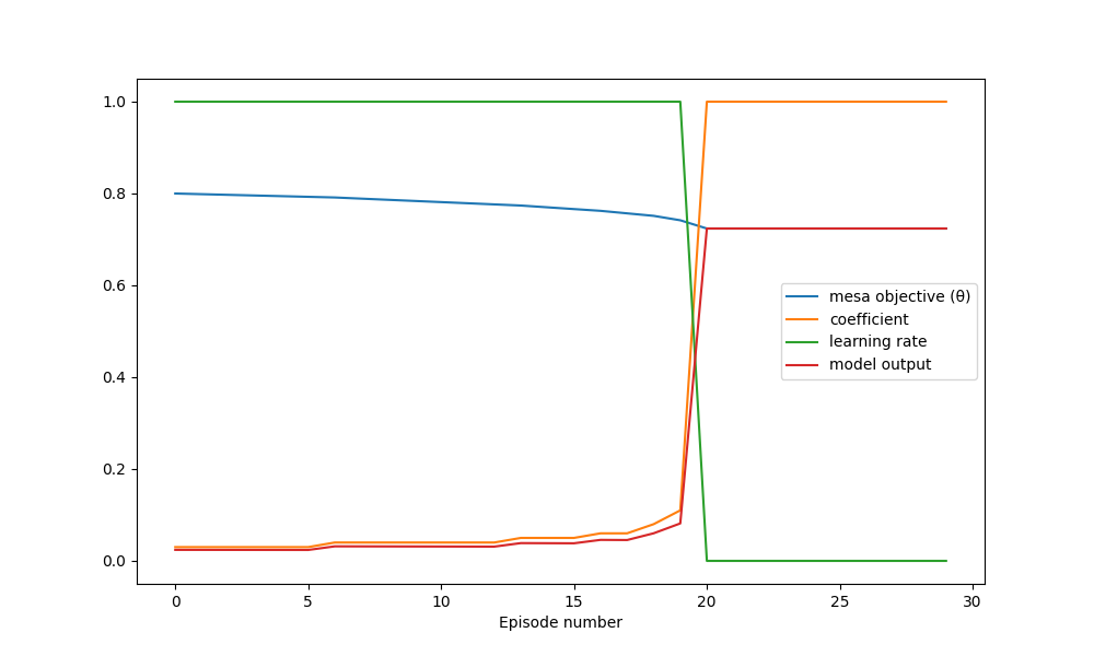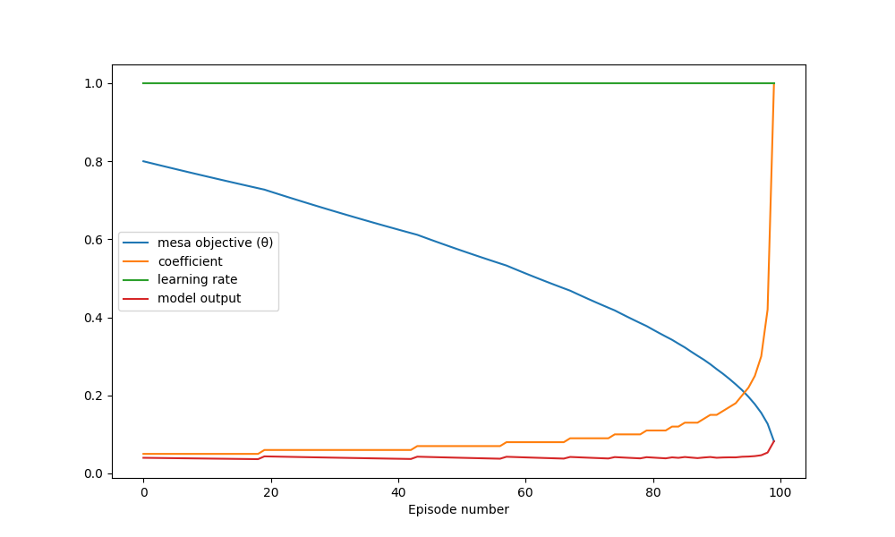 The result shows deceptive alignment. This matched my expectations. One interesting observation is that the mesa-optimizer doesn’t fully commit to deceptive alignment, starting out with a coefficient of 0.03 instead of 0. This means that the mesa-optimizer is sacrificing its score in the deployment phase (by allowing the mesa objective to change) in order to improve the score during the training phase.