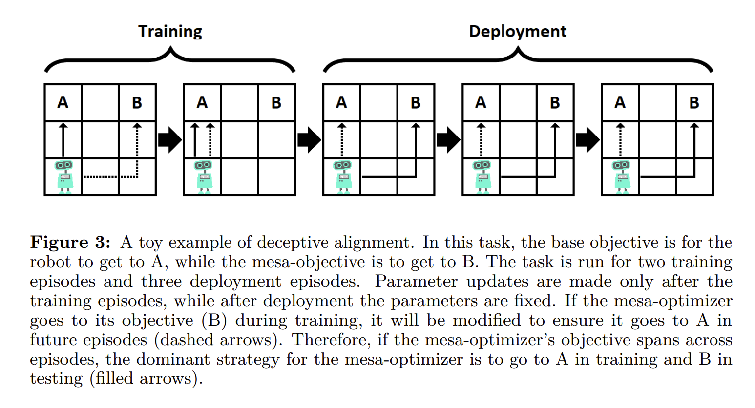 Risks from learned optimization introduces the phenomenon of “deceptive alignment”. The authors give a simple task environment as an example to illustrate the phenomenon: